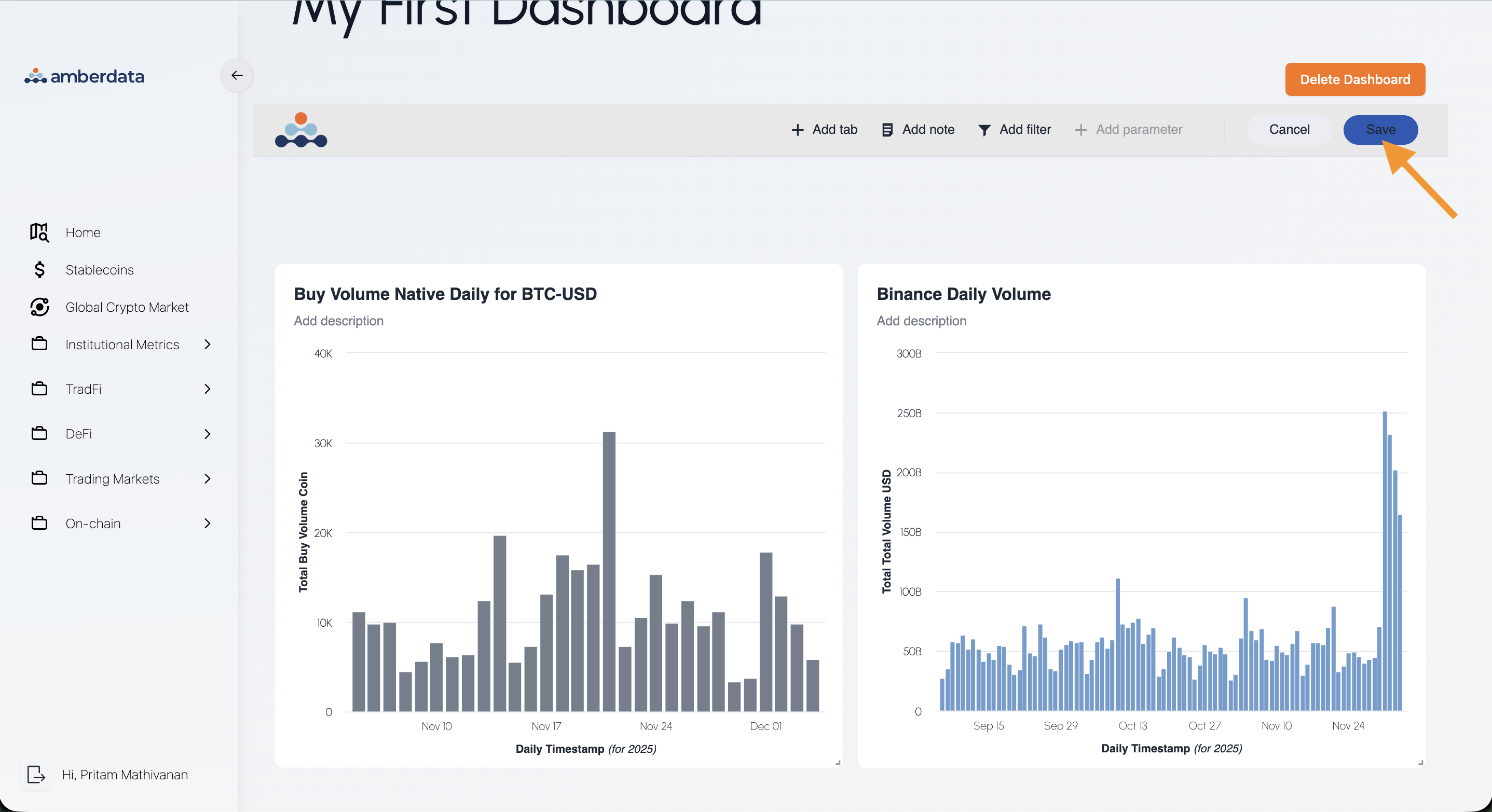 Skip to main contentThis guide explains various ways in which you can create and manage custom dashboards inside Amberdata Intelligence.