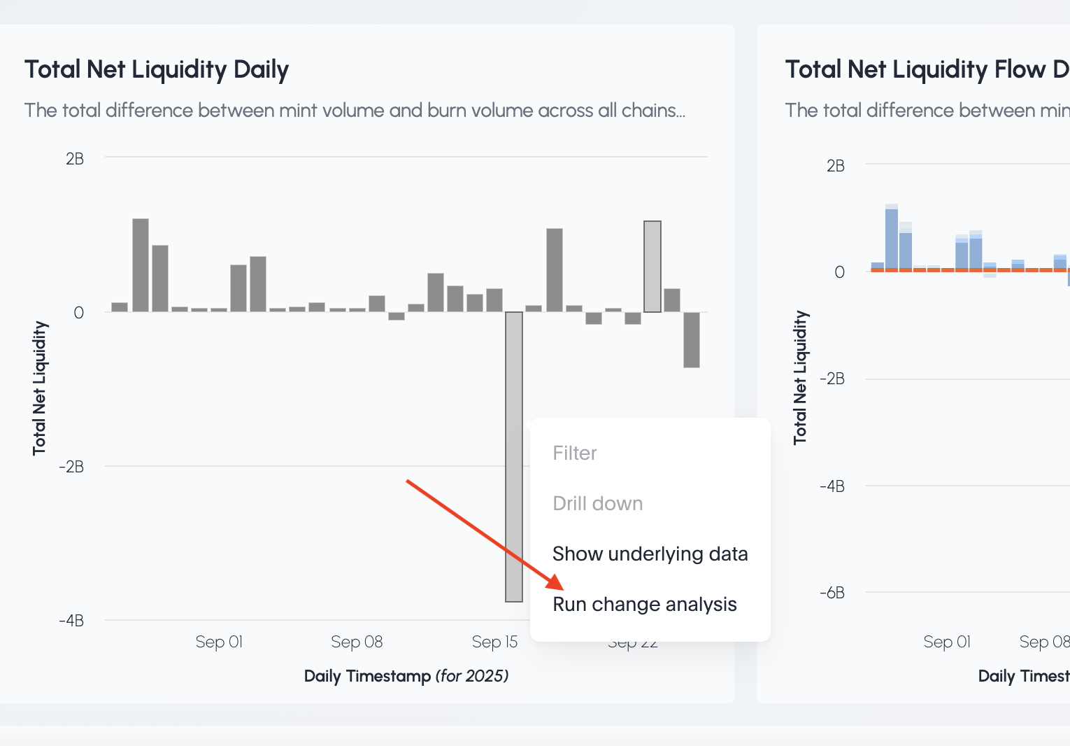 The Change Analysis feature allows comparison between two data points on a chart (e.g., different days or values) to understand what drove changes in the data, such as shifts in trading volume or liquidity.How to Use Change Analysis