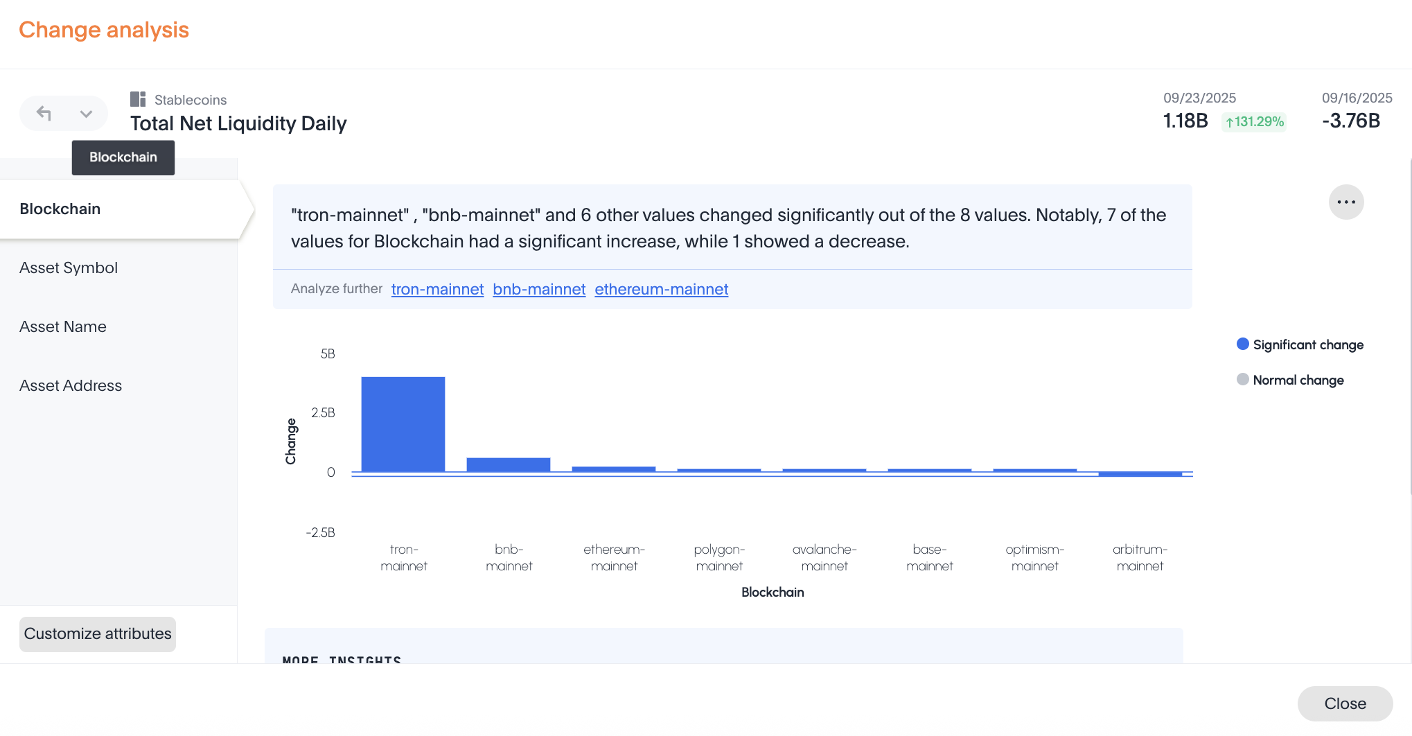 - Run Change Analysis to see an 86.23% decrease, with Ethereum Mainnet and USDS as major contributors.