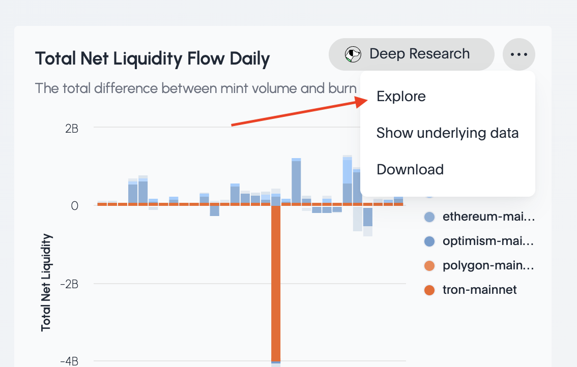 Access Explore: Click the “Explore” option on any chart (e.g., stablecoin liquidity or trading volume); hover over the top right of a chart and click the 3 dots to see ‘Explore’